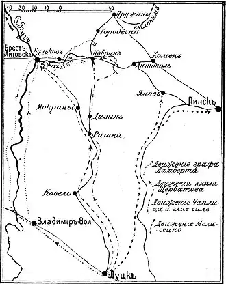 • The detachment of Major General Melissino (1 cavalry regiment and about an infantry battalion) was sent to Pinsk to demonstrate activity and to deceive Reynier about Tormasov's intentions.[4]
