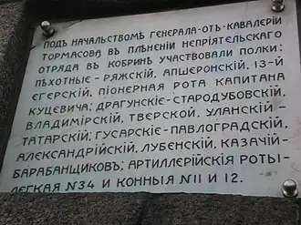 Memorial plaque on the monument of the victory of Russian troops in Kobryn