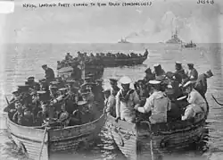 On 17 February 1915, a British seaplane from HMS Ark Royal flew a reconnaissance sortie over the Straits.[1] Two days later, the first attack on the Dardanelles began when a strong Anglo-French task force, including the British battleship HMS Queen Elizabeth, began a long-range bombardment of Ottoman artillery along the coast. A period of bad weather slowed the initial phase but by 25 February the outer forts had been reduced and the entrance cleared of mines. Royal Marines were landed to destroy guns at Kum Kale on the northern Asian coast and at Sedd el Bahr on the southern tip of the Gallipoli Peninsula, while the naval bombardment shifted to batteries between Kum Kale and Kephez.[2]