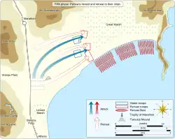 The second theory is simply that the battle occurred because the Persians finally moved to attack the Athenians.[41] Although this theory has the Persians moving to the strategic offensive, this can be reconciled with the traditional account of the Athenians attacking the Persians by assuming that, seeing the Persians advancing, the Athenians took the tactical offensive, and attacked them.[41] Obviously, it cannot be firmly established which theory (if either) is correct. However, both theories imply that there was some kind of Persian activity which occurred on or about the fifth day which ultimately triggered the battle.[41] It is also possible that both theories are correct: when the Persians sent the cavalry by ship to attack Athens, they simultaneously sent their infantry to attack at Marathon, triggering the Greek counterattack.