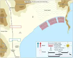 For approximately five days the armies therefore confronted each other across the plain of Marathon in stalemate.[33] The flanks of the Athenian camp were protected by either a grove of trees or an abbatis of stakes (depending on the exact reading).[36][37] Since every day brought the arrival of the Spartans closer, the delay worked in favor of the Athenians.[33] There were ten Athenian strategoi (generals) at Marathon, elected by each of the ten tribes that the Athenians were divided into; Miltiades was one of these.[38] In addition, in overall charge, was the War-Archon (polemarch), Callimachus, who had been elected by the whole citizen body.[39] Herodotus suggests that command rotated between the strategoi, each taking in turn a day to command the army.[40] He further suggests that each strategos, on his day in command, instead deferred to Miltiades.[40] In Herodotus's account, Miltiades is keen to attack the Persians (despite knowing that the Spartans are coming to aid the Athenians), but strangely, chooses to wait until his actual day of command to attack.[40] This passage is undoubtedly problematic; the Athenians had little to gain by attacking before the Spartans arrived,[41] and there is no real evidence of this rotating generalship.[42] There does, however, seem to have been a delay between the Athenian arrival at Marathon and the battle; Herodotus, who evidently believed that Miltiades was eager to attack, may have made a mistake while seeking to explain this delay.[42]