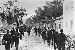 The attackers encountered a minefield of improvised mines (boxes with dynamite) planted by the Battalionists the previous afternoon and evening, during the negotiations with ELAS.[81] A new plan was made, aiming at the storming of Agios Ilias by a company of 2/9 Battalion under Kostas Basakidis.[82] This new assault forced the Battalionists to dismount the heavy machine gun from the clock tower, while the attack of 1/8 Battalion forced the garrison of the railway station to retreat to the bedesten, where a number of EAM sympathizers were being held hostage,[83] while major Smyrlis was located by ELAS partisans and was executed.[52] From the afternoon to nightfall, the lines of the combatants remained the same, but the losses suffered by the Battalionists led to a fall in their morale and unwillingness to continue the battle.[84] Their commander, Major Dionysios Papadopulos, sent a delegation to request aid from Panagiotis Stoupas in nearby Gargalianoi, but the delegates abandoned their mission as soon as they left Meligalas.[85]