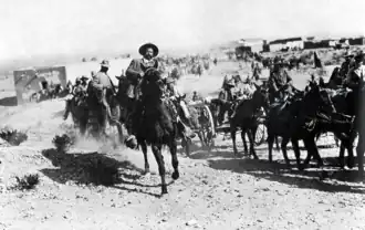 Villa returned to Mexico with only 8 companions from the United States in the spring, but as the months passed, more and more people joined him and acquired more and more weapons. After being appointed head of the revolutionary movement in Chihuahua, Pancho Villa reorganized the Northern Division, thus having more than 5,000 men integrating troops of infantry, cavalry and artillery weapons, in addition to having support services such as health, transportation and food. After fighting several battles, they captured Ciudad Juárez and moved on to Chihuahua, In order to take the city of Chihuahua, Francisco Villa pressured the federals in a battle, finishing these troops. The city became chaos and was sacked by Pascual Orozco's troops, so General Salvador Mercado ordered the evacuation of the city at the end of November 1913 and headed for Ojinaga, a border point with the United States, which allowed Villa to occupy the state capital on December 8 of the same year. General Mercado withdrew from the city of Chihuahua, for the interests of businessmen who saw in the federal forces a security for their money against the constitutionalists.[1] When leaving for Ojinaga, Mercado refused to start combat with the villistas, foreseeing that if Pancho Villa pursued him to the border, he would be helped by the North Americans and thus could return to the capital of the country.