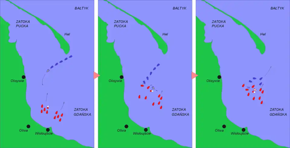 The Polish–Lithuanian fleet anchored off the Gdańsk roadstead, while the Swedish squadron sailed southwards from the Hel Peninsula. The Polish–Lithuanian squadrons weighed anchor and suddenly rushed towards the Swedish squadron, much to the surprise of the Swedes.