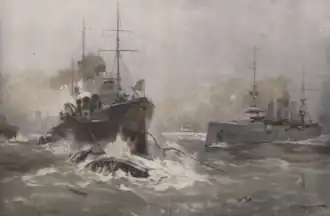 ![]() SMS Emden passing through the Penang Strait over the French torpedo boat, behind Zhemchug (painting by Carl Saltzmann) | |||||||