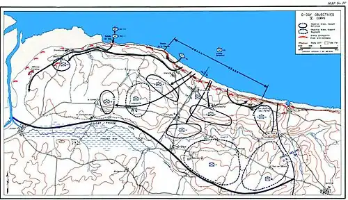 The main defences of Port-en-Bessin were on 200-foot (61 m) high cliffs known as the Western and Eastern features, either side of the hollow in which the port lay. An entrenched and concreted position had been built just south of the port on the Bayeux road, with more defences in the harbour.[2][5] Before the wireless was repaired to arrange covering fire, the Marines began a house-to-house battle through the port. The defensive position on the Bayeux road was charged and quickly overcome and its occupants captured. In the afternoon, after a bombardment by HMS Emerald and three squadrons of Typhoons firing RP-3 rockets, the cliff-top strong points were attacked and the base of the western feature captured.[5] A troop advanced on the eastern feature against rifle and machine-gun fire and grenades being thrown down the open slope, which was also mined and had hidden flame-throwers. When the Marines were well up the slope, two FLAK ships in the harbour opened fire, killing twelve and wounding 17 men, more than half the troop in a few minutes, forcing it to withdraw.[2]