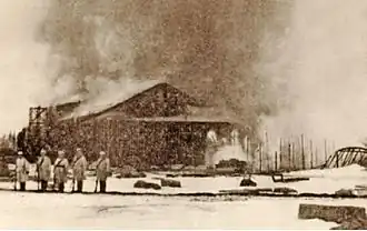The strengthened Whites started their offensive against Rautu on 25 March but were hit back as well as on 30–31 March. Two days later, the Whites cut the railroad towards Saint Petersburg and derailed an armored train with a cargo of ammunition, machine guns, and artillery pieces. The decisive attack was launched on 4 April, now with 2,000 men. The Reds were soon running out of ammunition and food supplies. In the morning of 5 April at 7:30 am, the Reds broke through the siege line on the southwest side of the station. The Red column headed south towards the Russian border but was soon caught in a crossfire of White machine guns in the nearby valley. Some of the Reds managed to escape but the machine-gun fire killed more than 400 Reds including a large number of women and children. The Bolshevik commander Prigorovski, as well as several wounded Reds, killed themselves in order to avoid falling into the hands of the enemy.[2][3] 800–900 Finnish Reds and Russian Bolsheviks were still taken as prisoners, including more than one hundred children.[4] The valley was soon nicknamed the ″Death Valley″ (Kuolemanlaakso) and in few years the name was even put on the map. After the victory in Rautu, the Whites were now able to concentrate their troops against Vyborg, the Red capital of Eastern Finland.[1]