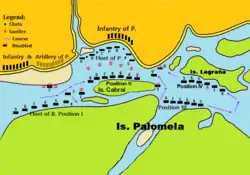 After the battle, the eight remaining Brazilian steamers sailed downriver.[10] President López ordered Major José María Bruguez with his batteries to quickly move inland to the south to wait for and attack the Brazilian fleet as it passed. On August 12, Bruguez attacked the fleet from the high cliffs at Cuevas. All Brazilian ships were hit, and 21 men were killed.[11]