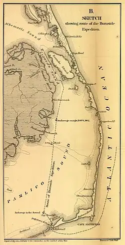 The entry into Pamlico Sound through Hatteras Inlet was time consuming. The swash, thought to be eight feet (2.4 m) deep, was found the hard way to be only six feet (1.8 m). Some of the Union Army ships drew too much to get across, and had to be kedged in after being lightened. Others were too deep even to be kedged in; the men or materials they carried had to be brought ashore on Hatteras Island, and the ships sent back. Bark John Trucks never made it at all; she could not get close enough to Hatteras Island even for the men aboard to be taken off. She returned to Annapolis with the majority of the regiment, the 53rd New York, and only a detachment of the command was active in the Battle of Roanoke Island.[19][20] Not until February 4 was the fleet as ready as it ever would be and assembled in Pamlico Sound.[21]