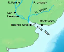 The battle was fought at the location of the modern city of San Lorenzo, Santa Fe which is next to the Paraná River, at the point of its widest flow. The west bank of the river was tall and steep, forming a natural obstacle, and ships could only land troops and materials on that side of the river using man-made paths cut into the side. The battlefield was near one of these paths, shaped like a ladder, after which the terrain was a big plain with scattered bushes. The San Carlos Convent, the main nearby building, was a short distance away from the river.[7]