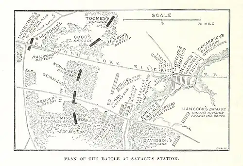 The Battle of Savage's Station took place on June 29, 1862, in Henrico County, Virginia, as the fourth of the Seven Days Battles (Peninsula Campaign) of the American Civil War. The main body of the Union Army of the Potomac began a general withdrawal toward the James River. Confederate Brig. Gen. John B. Magruder pursued along the railroad and the Williamsburg Road and struck Maj. Gen. Edwin Vose Sumner's II Corps (the Union rearguard) with three brigades near Savage's Station, while Maj. Gen. Thomas J. "Stonewall" Jackson's divisions were stalled north of the Chickahominy River. Union forces continued to withdraw across White Oak Swamp, abandoning supplies and more than 2,500 wounded soldiers in a field hospital.