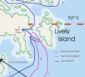 At 4:00 am GMT on 23 May,[1] a Lynx helicopter (serial number XZ721)[7] from HMS Brilliant identified Monsunen while the latter was heading to the north, west of Lively Island. After a surrender order was radioed to the motorboat, another Lynx transporting a Special Boat Service (SBS) team tried to intercept her. The aircraft was engaged by heavy machine gun and small arms fire, so it was forced to abort the mission.[8][9] At the same time, Monsunen's radar picked up the British squadron about eight miles (13 km) to stern and approaching aggressively.[3] Corvette Lieutenant Oscar Vázquez, Gopcevich's second-in-command, later reported that while Brilliant was closing on them from the south, Yarmouth sailed ahead to Choiseul Sound, blocking the passage from the north.[10]