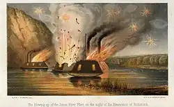 Fortunately for the Union, four of the rebel ships grounded when the tide lowered that morning. At 1:45 am, Commodore Mitchell and his men finished clearing the obstructions so he steamed the Fredericksburg back over to where the remaining ships were anchored. It was then that Mitchell discovered the Virginia II, the Richmond, the Drewry, and the Scorpion were all resting on the river bottom and could not be freed until high tide which would come at about 11:00 am. The situation was complicated further at day break when the Union batteries started to become more accurate. The Richmond was hit repeatedly by artillery rounds but her armor protected her from serious damage. It was different for the unarmored gunboats, because these ships were mainly wooden vessels, they were "torn to pieces" by enemy fire. Drewry was so heavily damaged that her crew abandoned ship just in time because fifteen minutes later, at 6:55 am, a round from one of the batteries ignited the vessel's powder magazine. Instantly the gunboat exploded violently and sank. The large shock wave also heavily damaged the nearby Scorpion which had to be abandoned as well. Two men were killed on the torpedo boat and it sank along with the Drewry. To make matters worse for Commodore Mitchell, at 10:30 am lookouts spotted the Onondaga, the two gunboats, and the Spuyten Duyvil heading for them.[2]