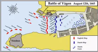 The Battle of Vågen was a naval battle between a Dutch merchant and treasure fleet and an English flotilla of warships in 2 August 1665 as part of the Second Anglo-Dutch War. The battle took place in Vågen (meaning "the bay, voe" in Norwegian), the main port area of neutral Bergen, Norway. Due to a delay in orders, the Norwegian commanders took the side of the Dutch, contrary to the secret intentions of the King of Norway and Denmark. The battle ended with the retreat of the English fleet, which was much damaged but had lost no ships. The treasure fleet was relieved by the Dutch home fleet 17 days later.