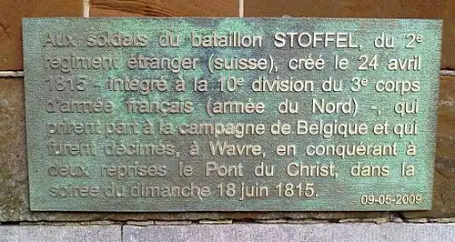 - ^ The wording on the plaque translates as: "To the soldiers of the STOFFEL battalion, of the 2nd Foreign Regiment (Swiss) created on 24 April 1815 - integrated into the 10th Division of the 3rd Corps of the French Army (Army of the North) - who took part in the Belgian campaign and who were decimated, at Wavre, while twice conquering the Christ Bridge, on the evening of Sunday, 18 June 1815."