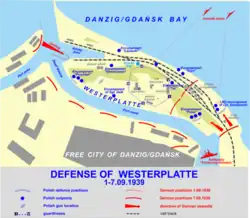 The Battle of Westerplatte was the first battle of the German invasion of Poland, marking the start of World War II in Europe.[1] It occurred on the Westerplatte peninsula in the harbour of the Free City of Danzig (now Gdańsk, Poland). A small forested island separated from Gdansk by the harbour channel, Westerplatte was established as a Polish military outpost during the interwar period.[2]