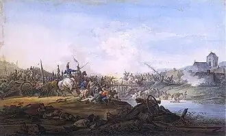 After collapsing the Russian advance, Poniatowski organised an attack group from division Wielhorski units.[8] This group contained three infantry battalions from regiments Potocki, Malczewski and ordnance ostrogocka, Brigade National Cavalry under command of Dzierżek, and regiment front watch under command of Józef Lubomirski. The group had to attack the Russian right wing. Morkov, who watched the preparations, concentrated most of his formation against the group. Polish cavalry successfully fought the Russian cavalry and forced them to withdrawal. But when Wielhorski met the enemy infantry, he stopped the advance because his infantry was weaker than the Russians and inexperienced. About 5 p.m. Morkov, who did not get relief from Kutuzov, withdrew.[9]