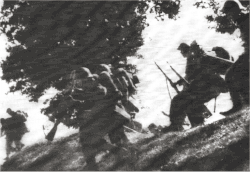 In the morning, the Germans started their drive towards the south along both banks of the Bzura and were supported by more than 300 aircraft and heavy artillery.[20] German howitzers, taking advantage of their position on the high ground of the Vistula's right bank, shelled Polish positions for the entire day.[20] After two days of heavy fighting, with no ammunition or food rations remaining, further attempts at a breakout for the Poles became impossible.[10]