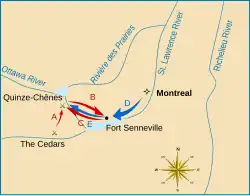 Following his successes, Forster moved his forces, including all of the prisoners, down to Quinze-Chênes, where more Loyalist militia had assembled. Leaving some of the prisoners there, he advanced on May 23 to Fort Senneville, a fortified works on the southwest tip of Montreal Island that was owned by Montigny.[4] In the meantime, Arnold gathered most of the few remaining forces in Montreal, and sent requests to the outposts around the city for additional troops. By May 24, he was entrenched at Lachine, south of the city, and his force had reached 450 men. Forster began to advance on Lachine, but decided to retreat back to Quinze-Chênes when his scouts notified him of Arnold's position. He also received intelligence from Montreal that Arnold's force was going to be massively reinforced—the reported number of reinforcements was 1,50 to 2,000 men, more than Arnold had available in the area.[28][29]