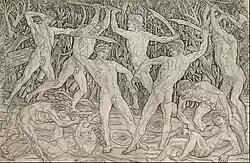 The Battle of the Nudes or Battle of the Naked Men,[1] probably dating from 1465–1475, is an engraving by the Florentine goldsmith and sculptor Antonio del Pollaiuolo which is one of the most significant old master prints of the Italian Renaissance. The engraving is large at 42.4 × 60.9 cm, and depicts five men wearing headbands and five men without, fighting in pairs with weapons in front of a dense background of vegetation.