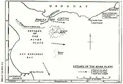 Graf Spee had sailed into the South Atlantic in August 1939, before the war began, and had begun commerce raiding after receiving the appropriate authorisation on 26 September 1939.[5] Harwood's squadron was one of several search groups sent in pursuit by the British Admiralty and sighted Graf Spee off the estuary of the River Plate (a.k.a. the Río de la Plata) near the coasts of Argentina and Uruguay.[6]
