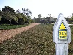 Popular with joggers and dog walkers, amenities along the trail include quarter-mile markers, outdoor fitness equipment, public art installations, benches and drinking fountains.[5][6] For those who seek an extended workout, two blocks from the southern terminus of the greenway, down Herondo Street, is the Strand, part of the larger 22-mile (35 km) Coastal Bike Trail along the Pacific Ocean.[6]