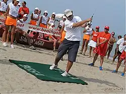 Beach golf was created in Pescara, Italy in 1999 by Mauro De Marco.[1] It was designed to be played on crowded beaches during the summer. Objects on the beach are incorporated into the game. Beach umbrellas, bathing people and other objects are turned into obstacles of the game. The rules allow the audience to interact with participants.