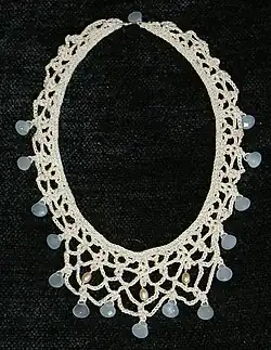 Bead crochet is a crochet technique that incorporates beads into a crochet fabric. The technique is used to produce decorative effects in women's fashion accessories. The word "crochet" is derived from the French croche or croc meaning "to hook".[1] Published descriptions of bead crochet date from around 1824, although it was probably common before then.[2] At one time, bead crochet was thought by some people to be appropriate only for rich people.[3]