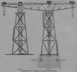The Beardmore Crane had two opposite cantilevered jibs, both equipped with moving winches, for a total length of 233 feet (71 m).[1] From the jib to the ground extended a tapering lattice, which was enclosed by a lattice tower. The jib was slewed by a mechanism on the ground, and bearings at the top of the tower and where the extension met the ground allowed it to turn.[1][2] The winch on each arm was powered by two 52 horsepower (39 kW) electric motors for hoisting and two 14 horsepower (10 kW) motors for slewing, and a 18 horsepower (13 kW) motor for slewing.[1] The tower took eight minutes to make a full revolution.[1]
