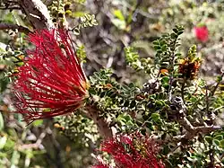 The flowers are usually red to dark purplish red but other colours and white flowers are sometimes seen. They are arranged in heads about 20 millimetres (0.8 in) in diameter, on the ends of branches which continue to grow after flowering. The flowers have 5 sepals, 5 petals and 5 bundles of stamens. Each bundle contains 4 to 7 stamens joined for about 3–4 millimetres (0.1–0.2 in) long of their length with the free parts a further 4–6 millimetres (0.2–0.2 in) long. Flowering occurs from June to January but mostly from October to December and is followed by fruits which are woody, almost spherical capsules 8–10 millimetres (0.3–0.4 in) in diameter.[2][3][4]