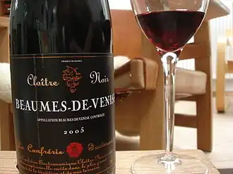 The vines are grown on the slopes around the foot of the Dentelles de Montmirail, a vertical comb of rock jutting out of the plain between the Rhône river and the Luberon-Ventoux mountains.[1] Beaumes is famed for its natural fortified wine made from the Muscat grape, and records of its use go back almost two millennia. More recently it is also the producer of a high quality red wine. In 1943 the natural Sweet Beaumes de Venise Muscat was accorded its appellation d'origine contrôlée (AOC), to be followed in 1956 by an AOC for its Côtes du Rhône. The red, white and rosé wines were elevated to the appellation of Côtes-du-Rhône Villages AOC (named villages) in 1978, and in 2005 the greatest honor of all was bestowed on the region when Beaumes de Venise rouge and the sweet fortified wine Muscat de Beaumes de Venise became a cru - the highest order of the wines in the Rhône Valley. Today, over 100 producers including fifteen domaines and a cooperative winery combine their efforts to maintain the highest standards and the centuries-old reputation of the town and its wines.[2]