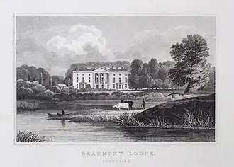 The current chief building, then known as Bowman's Lodge, was originally built in 1705 to a design by James Gibbs.[1] In 1714 Thomas Thynne, 2nd Viscount Weymouth, inherited the estate; and in the mid-eighteenth century it was acquired by Sophia, Duchess of Kent. In 1751 the Duke of Roxburghe purchased the land for his eldest son, the Marquess of Bowmont and Cessford (then a boy at Eton College), and renamed it Beaumont in his honour. In 1786 Warren Hastings, the first Governor-General of India, acquired Beaumont Lodge at the cost of £12,000. He lived at Beaumont for three years. In 1789 the estate was sold to Henry Griffith, an Anglo-Indian, who had the Windsor architect Henry Emlyn extensively rebuild the house in 1790 as a nine-bay mansion with a substantial portico.