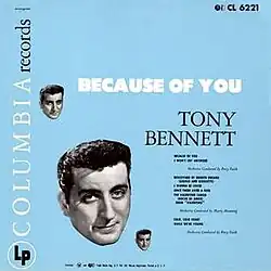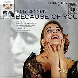 Because of You is the debut album by American singer Tony Bennett.[2] It was originally released in 1952 on Columbia as CL 6221, then reissued in 1956 (CL 2550) as part of "House Party Series".