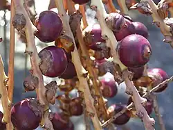 The inflorescence is infrafoliar and surrounded by a 90 cm (35 in) long, leathery spathe, which curls up on itself after abscission (due to drying out). The inflorescence stalk is 8–13 cm (3.1–5.1 in) long and elliptic in cross-section. The rachis is very short, 8–9 cm (3.1–3.5 in) long and bearing about 30–50 crowded, spirally arranged rachillae. The fruit is oblate, 1.6 cm × 2.4 cm (0.6 in × 0.9 in) and dark purplish-black at maturity.[2]