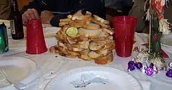 A beefsteak is a type of banquet in which sliced beef tenderloin is served to diners as all-you-can-eat finger food. The dining style originated in 19th-century New York City as a type of working-class celebration but went into a decline in the mid-20th century. Resurrected by caterers in New Jersey, the beefsteak banquet style remained popular in that state's Bergen and Passaic counties, and is enjoying a revival in New York City,[1] where the style originated, due to the reemergence of a biannual beefsteak in Brooklyn.[2] Similar "beef and beer fundraisers" are common in the Philadelphia region, especially in white working class communities.[3]