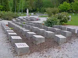 Immediately after the Second World War, six known mass graves were created as a result of executions by the communists. The Krpin Gravel Pit 1 and 2 mass graves (Slovene: Grobišče peskokop Krpin 1, 2) are located north of the settlement; the first is in the bushes a few meters above the paved road, between a gravel pit and a dirt road, and the second is a few dozen meters higher, on a slope to the left of the path. The graves contain the remains of at least 20 Russian Liberation Army prisoners of war and civilians that were murdered at the end of June or beginning of July 1945.[13][14] The Krpin Ski Slope 1–3 mass graves (Grobišče smučišče Krpin 1–3) are located north of the settlement; the first and second are in a picnic area behind a shed, and the third is on level ground behind the ski slope. The graves contain the remains of Russian Liberation Army prisoners of war and civilians murdered at two locations in the nearby gravel pit.[15][16][17] The Mazevec Crevasse Mass Grave (Grobišče Mazevčev pruh) is located north of Kamen Castle, on the edge of a quarry below a large spruce tree, and is 10 m long. It contains the remains of German prisoners of war from Begunje and probably also civilian victims murdered on May 29, 1945.[18]