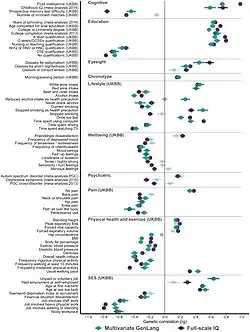 Genome-wide association studies In genome-wide association studies, researchers test the relationship of millions of genetic polymorphisms with behavioural phenotypes across the genome.[33] This approach to genetic association studies is largely atheoretical, and typically not guided by a particular biological hypothesis regarding the phenotype.[33] Genetic association findings for behavioural traits and psychiatric disorders have been found to be highly polygenic (involving many small genetic effects).[40][41][42][43][44]Study results about which and to what degree various traits, IQ and language-related skills appear to be influenced by genetics[45][46] Genetic variants identified to be associated with some trait or disease through GWAS may be used to improve disease risk predictions. However, the genetic variants identified through GWAS of common genetic variants are most likely to have a modest effect on disease risk or development of a given trait. This is different from the strong genetic contribution seen in Mendelian conditions or for some rare variants that may have a larger effect on disease.
