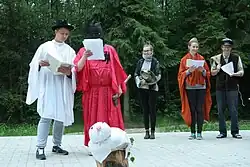 The ritual was first mentioned in an 1851 text by Florian Ceynowa, who described the custom as it was in his home village. Also Jan Patock writes about the ritual in Dzień św. Jana na Kaszubach [St. John's Day in the Kashubia region] (1932).[7] Today the custom takes place in summer, usually in June. Local activists, actors and volunteers perform in a number of Kashubian villages (Łączyńska Huta, Wdzydze Kiszewskie, Szymbark, Strzelno).