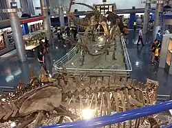 The Cenozoic gallery has multiple mounts of Paraceratherium, Stegodon, and Megaloceros. Also on display is a skull of a woolly mammoth. In a glass case, a skeleton of an entelodont is featured. Also on display are skulls of several prehistoric mammals, including Homotherium, Megaloceros, and Elasmotherium.