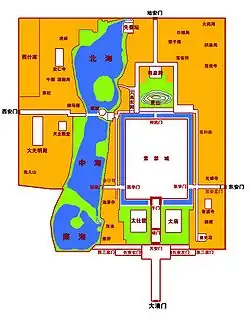 Beijing, the political, cultural, military, and commercial centre of the empire, was the capital city of the last three dynasties of China; it was the last imperial capital built in China's history. Continuing and improving upon the construction and planning traditions of earlier dynasties, Beijing embodied some of the highest achievements in the field of city planning during the Ming and Qing dynasties.[27] The construction of the fortification system borrowed ideas from Dadu of the Yuan era and Nanjing of the Ming era, and typified the Yuan and post-Yuan pre-Republican era city planning styles. It is the final example of China's 3,200 year-long square-shaped dynastical city planning style. It closely matched the scale of Chang'an of the Tang dynasty. The city was carefully planned during the early Ming dynasty, with a central axis running through the midpoints of the northern and southern walls, dividing the city into two equal parts to fulfil the Confucian ideals of "Golden mean"(居中不偏) and "不重不威". The Forbidden city was at the centre of it all, with Longevity Mount (Jingshan) just north of the palaces. The Imperial city, surrounding the palaces, provided everything necessary for the maintenance of the Emperor's lifestyle within the Forbidden city. The southern sections of the city were allocated to officials and bureaucrats, while the Inner and Outer city served as extra protection for the Imperial city and the palace complex. The streets, avenues, and boulevards of the city were straight and wide, presenting the imperialistic ideal of order. Everything, including Buddhist temples, Taoist temples, business districts, parks, and imperial family residences were all planned in accordance with the city's layout, its order being much stricter than that of Dadu, and larger in scale.[28] The design of Beijing's fortifications borrowed elements from the Wujing Zongyao of the Northern Song dynasty (960–1127) and the already highly developed fortification construction expertise of the Southern Song (1127–1279). All of the structures used bricks and stones as foundations rather than rammed earth, including the watchtowers, the corner guard towers, the barbicans, the enemy sight towers, and the sluice gate towers. Forming both a planar and spatial defence for the city, it was dynastical China's best fortified city defence system, displaying the late dynastical China's greatest achievements in city fortification design.[29]