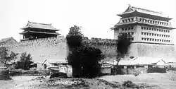 During the Ming and Qing dynasties, the principal defensive weapons were firelocks, cannons, and bows and arrows. In 1629, Houjin troops attacked Beijing, and in 1644, Li Zicheng's troops laid siege to Beijing. Troops atop the city walls used cannons extensively during both sieges.[8] During the Second Opium War (1856–1860), invading troops stationed outside the city walls gave up, because Beijing was too extensively protected. Between 13 August and 15 August 1900, when the Eight-Nation Alliance invaded Beijing, the fortifications withstood bombardment by cannon attacks for two full days before being overrun. The Qing forces took full advantage of their higher elevation and the protection of the thick walls to shoot Alliance troops. Russian and Japanese forces attempted several times to use nitrocellulose to blow a gap in the wall at Dongzhimen and Chaoyangmen, but failed because the soldiers could not get close enough to light the fuse without being shot.[9] The barbicans, enemy sight towers, and corner guard towers proved to be quite effective at deterring enemy attacks. For example, on the night of 13 August, Russian troops succeeded in invading Dongbianmen's watchtower, but suffered heavy casualties in the barbican. It wasn't until the late morning of 14 August that they conquered the gate tower at Dongbianmen, a mere 50 metres (160 ft) away.[10] Even after the Outer City and Inner City fell to Alliance forces, the Imperial city's defenses still held. On the morning of 15 August, American forces used several guns to try to destroy the Tiananmen gates, but they held. Japanese troops used ladders to scale the wall and open the gates, thus allowing Alliance troops into the Imperial city.[10] In an incident on 25 July 1937, a battalion of Japanese troops camped at Fengtai District, declaring that they intended "to protect Japanese immigrants" and "to protect Dongjiaomin Street's Embassy district", tried to advance into Beijing. When they began entering Guang'anmen, around twenty Chinese soldiers fired on them from atop the gate tower, forcing them to abandon their plan. Thus even in the modern era of the 1930s and 1940s, the dilapidated fortifications were still useful defensively.