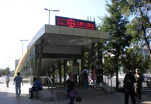 Beilinggongyuan (Chinese: 北陵公园站; pinyin: Běilínggōngyuán Zhàn) is a station on Line 2 of the Shenyang Metro.[1] The station opened on 30 December 2011.[2] This station locates at the south gate of the Qing Zhao Mausoleum and Beiling Park, also known as Zhaoling or Beiling.