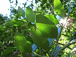 It can measure 30 m in height and one metre in diameter. The trunk is straight and branched, and the bark is gray with longitudinal fissures. Leaves are opposite and subopposite, elliptical to aovate-elliptical, and they have entire margins; they are glossy green above and glaucous below. The apex is rounded or slightly emarginated and the base is lightly wedge-shaped. The leaves are about 3–7.5 cm long and 2–4 cm wide, with pubescent petioles 2–5 mm long. The hermaphrodite flowers are arranged in inflorescences about 5–6 cm long. The pedicellate flowers are 4–6 mm and greenish-yellow in color.[2] The edible fruit is a green, globose drupe with a single seed, 1.5–2 cm in diameter, with a point at the apex.