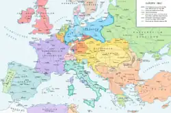 In Belgium of the time, many railway lines had been built by the government, but some lines had been given to commercial companies. This was the case especially in the east of Belgium.[1] There was the Grande compagnie du Luxembourg with a line from Luxembourg to the north, and the Chemin de fer Liégeois-Limbourgeois with a line from Liège to the Dutch border. Both companies were in financial difficulties. The Belgian state did not want to buy them out, so in October 1868 they turned to a French railway company: the Chemins de fer de l'Est. It had already taken over the lines of the Société royale grand-ducale des chemins de fer Guillaume-Luxembourg from Luxembourg for 45 years at the beginning of the year. This would have given the Est control of the rail network from the Swiss to the Dutch border. It was financially supported by the French government.[2]