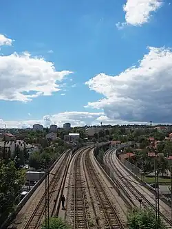 The Zemun railway station was built from 1977 to 1981 when was opened, even though it was never fully finished.[5] In the early 1980s, the marshaling yard in Makiš was arranged. In 1982 the double-track railway Zemun-Zemun Polje was finished and part of the passenger-technical Zemun railway station was built. In 1984 double-track railway New Belgrade-Belgrade Centre, across the New Railway Bridge was finished, so as the "Senjak" tunnel, the continuation of the bridge, which connects it with the Prokop station. In 1988 the two single-track railway tubes ("Dedinje" tunnel) were finished, establishing the connection Belgrade Centre-Rakovica-Jajinci. The tunnel is 3 km (1.9 mi). There were significant problems during the digging under the Humska Street (Partizan Stadium) and the royal palace of Beli Dvor.[2][6]