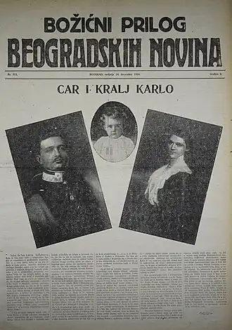 The Belgrader Nachrichten (Serbian: Beogradske Novine, lit.'Belgrade News'), was the official occupation periodical of the Austro-Hungarian Military Governorate in Serbia during the First World War. As the main propaganda organ, the focus of the newspaper was to portray the occupation and its government as benevolent and working in the interest of the Serb population. It was published daily, in German, Serbo-Croatian and Hungarian from 1915 to 1918, during the occupation of Serbia.[1]