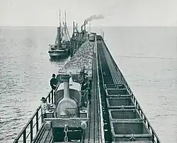 Coal was sent from the mines by rail to the jetty. There were two rail tracks on the jetty—a more elevated one for full coal wagons and another lower one for empty wagons—and two loading chutes (one for each hold of a 'sixty-miler'.)[13] The wagons were separated for tipping. One end of the coal wagon was raised by a steam ram, acting on a wagon axle, tipping the coal through a hinged panel in the other end. The coal then passed through a chute, directly into one hold of the ship moored alongside the jetty.[17] In 1909, six colliers were loaded with a total of 4,500 tons in 14 hours.[18]