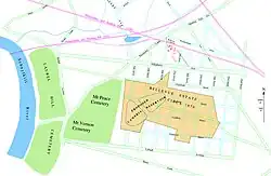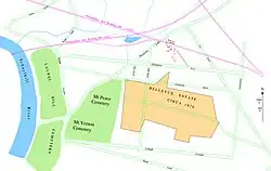 Map of the Bellevue Estate in 1870. Much of the estate near the train tracks had been sold, and some additional lots were purchased by the family south of Lamb Tavern Road.