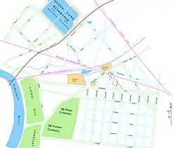 Map of the Bellevue Estate in 1840. The Reading Railroad built its Norristown line 30 yards (27 m) north of Bellevue Mansion, with the Bellevue station nearby. With this progress, the quiet of the estate was doomed and the family began selling off lots near the train right of way. A second rail line, constructed nearby in 1842, carried anthracite coal from northern Pennsylvania to large coal terminal on the Delaware River at Port Richmond.