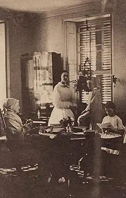 Interior of Bellevue Mansion, 1858. Deborah Fisher Wharton sitting at left. Anna Wharton, standing, died in 1863 at 29 of tuberculosis. Mary Wharton Thurston's children, William and Esther (Hetty), orphaned in 1861, at right.